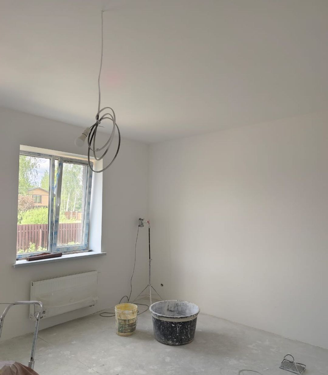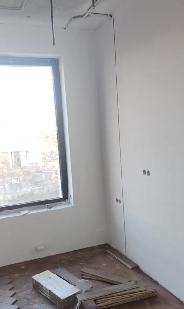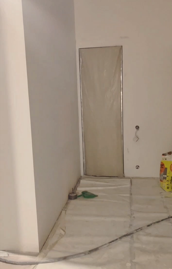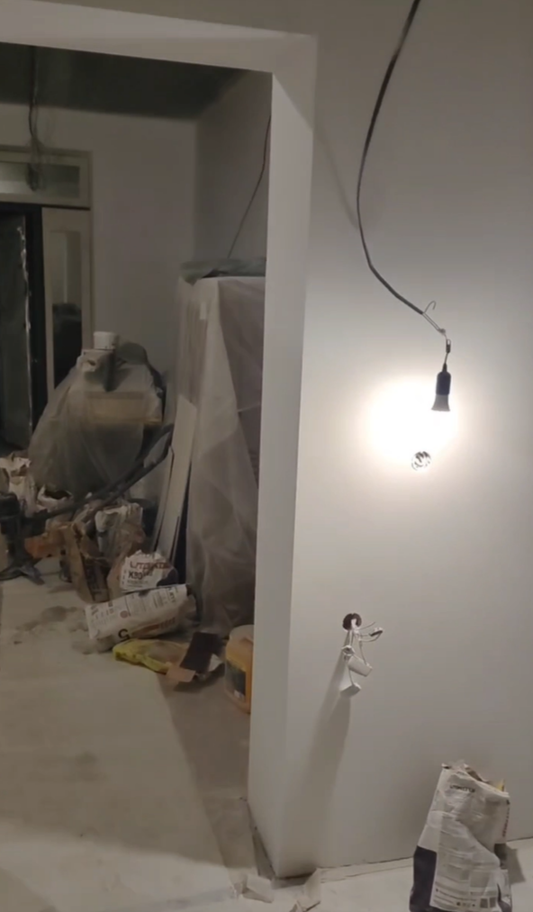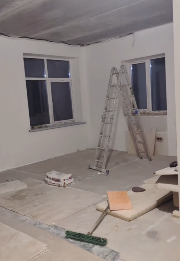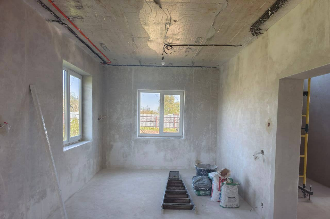 Выбрали Knauf MP 75 под шпаклевку. Она имеет гипсовую основу, Knauf MP 75 быстро застывает, что ускоряет сроки выполнения работ, имеет лучшее сцепление, по сравнению с известковыми и цементными смесями. Часть комнат шпаклевалась под покраску, часть под обои. Работы были выполнены за 1 неделю.