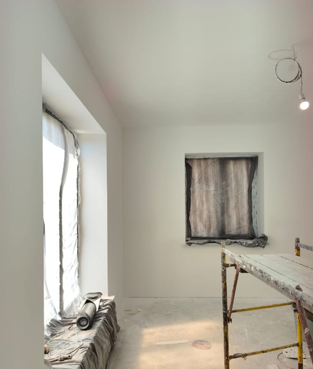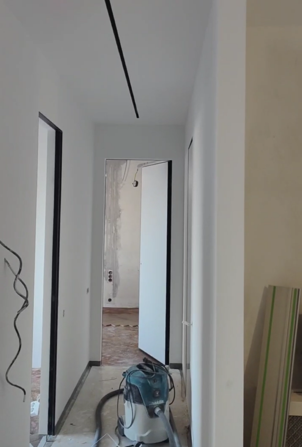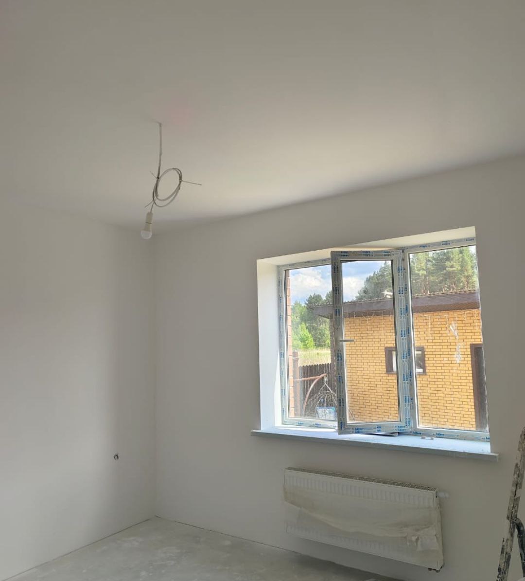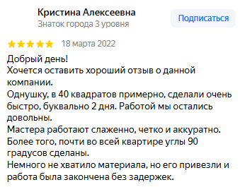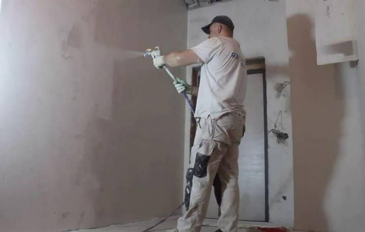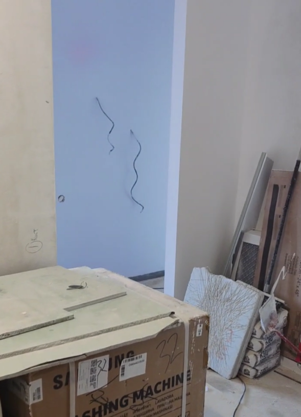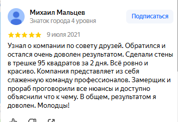 Выбрали Knauf MP 75 под шпаклевку. Она имеет гипсовую основу, Knauf MP 75 быстро застывает, что ускоряет сроки выполнения работ, имеет лучшее сцепление, по сравнению с известковыми и цементными смесями. Часть комнат шпаклевалась под покраску, часть под обои. Работы были выполнены за 1 неделю.